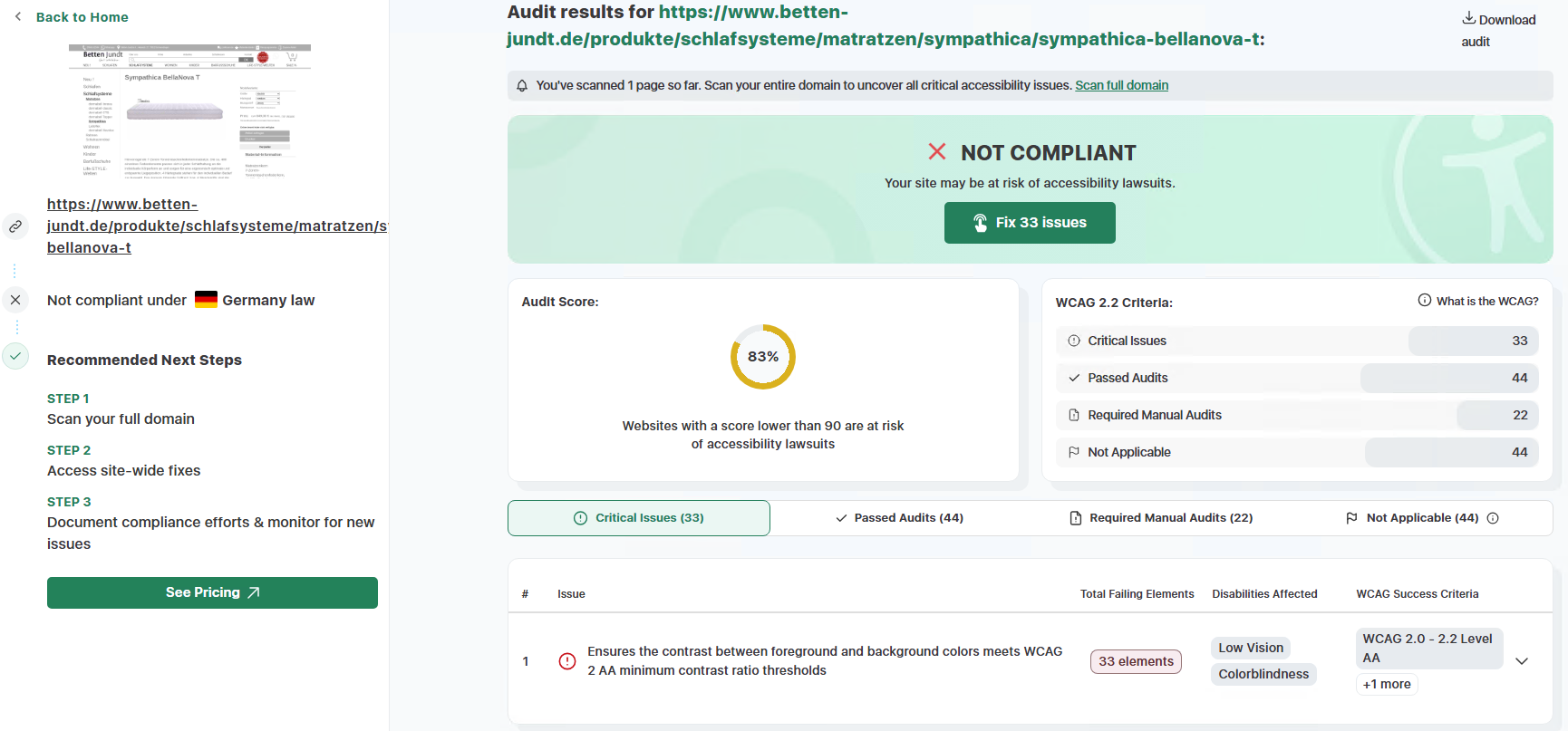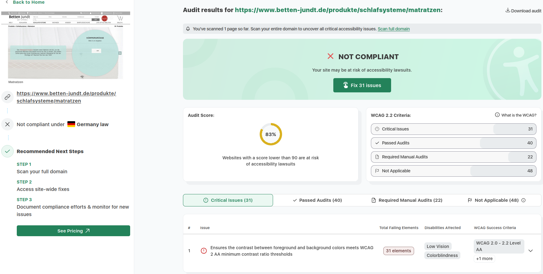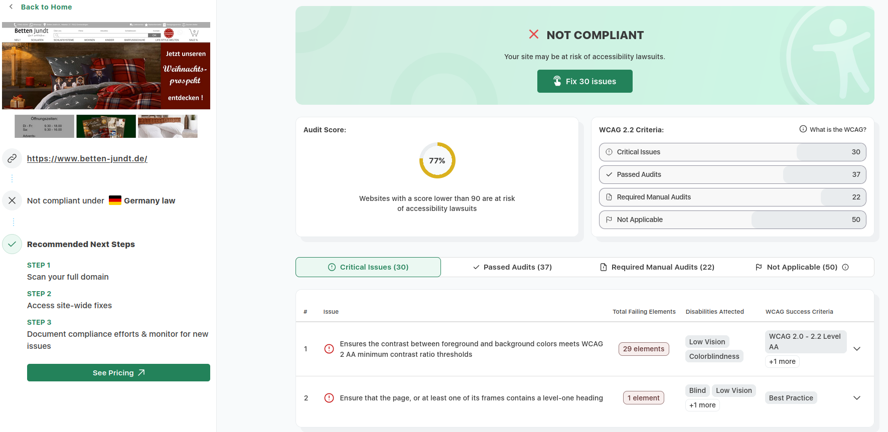 Zur Veranschaulichung unserer kontinuierlichen Überprüfungen der Barrierefreiheit haben wir Ergebnisse aus dem etablierten Tool accessibilitychecker.org dokumentiert. Diese Screenshots illustrieren exemplarisch identifizierte Barrieren sowie die erzielten Fortschritte. Im Folgenden finden Sie drei ausgewählte Screenshots solcher Prüfungen:
