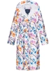 Wunderschöner  Damenbademantel mit Kapuze auf weicher, bunt bedruckter Morgenstern Skylight Ware. Die Qualität ist extraleicht, saugstark und schlingenfest. Der Mantel hat einen Bindegürtel und zwei Taschen.  Qualität:  45 % Viskose (Bambus), 35 % Polyester (Microfaser) und 20 % Baumwolle. Rückenlänge: 100 cm